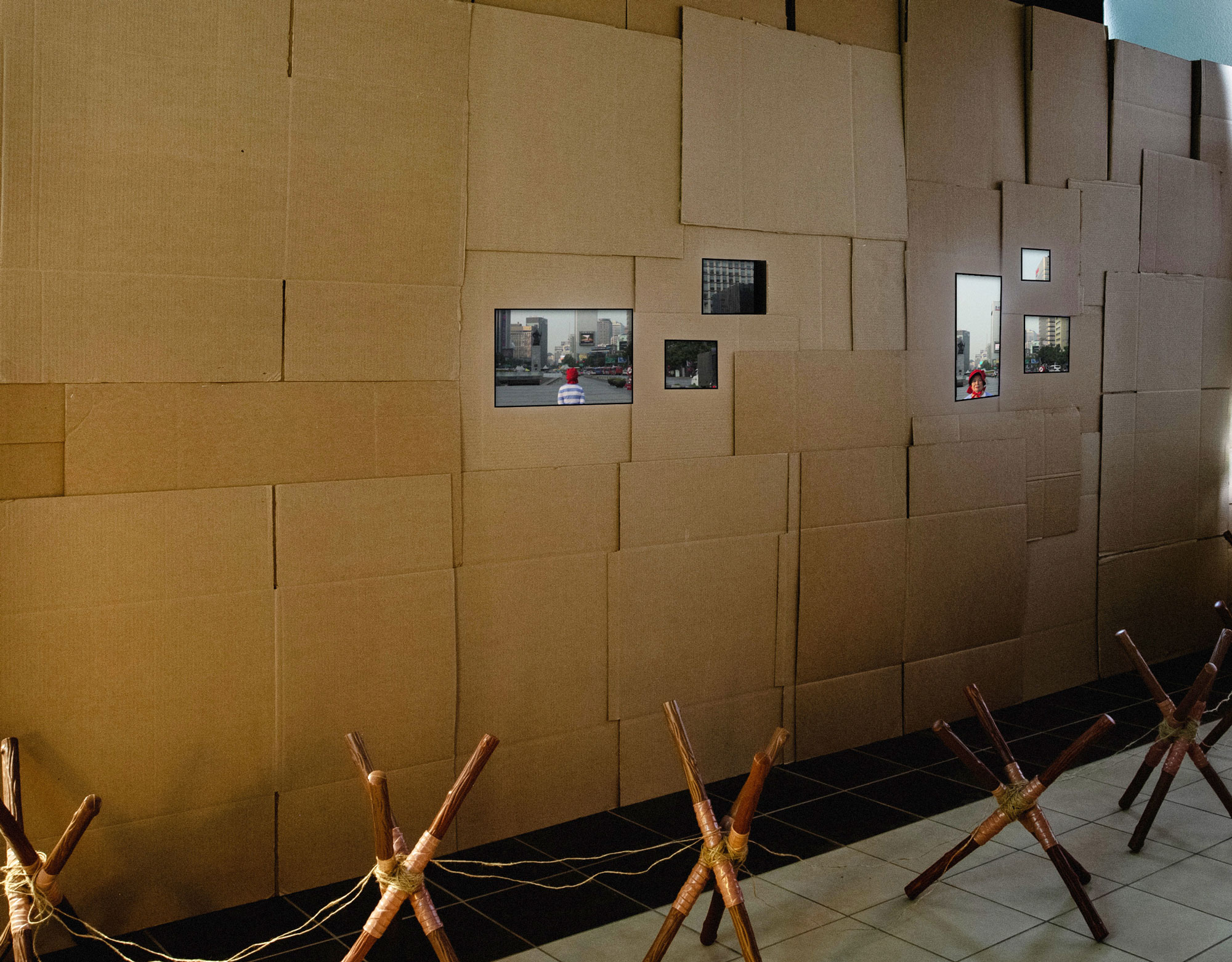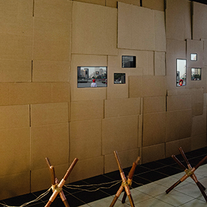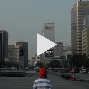 In the multi-channel video installation, A Red Drop of Sun, Mrs. Kim, dressed in the Sun-Maid’s iconic red bonnet, walks to and from the historic Gyeongbokgung Palace on a traffic median in downtown Seoul. The video imagery is fragmented and inset into a cardboard wall and isolated behind a faux barricade of toy nunchucks.