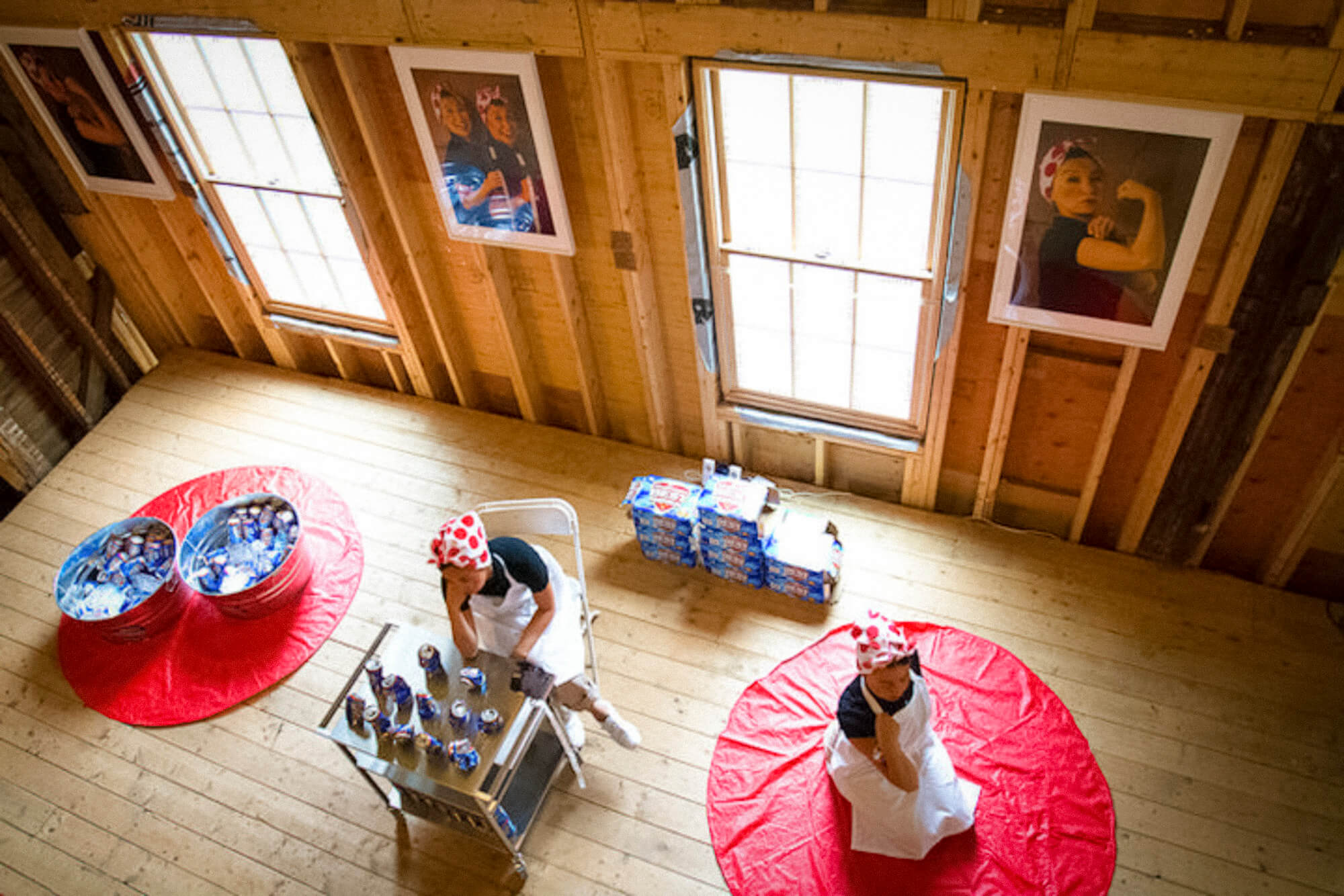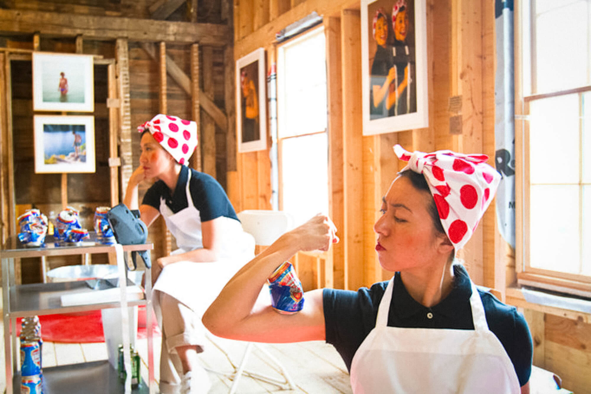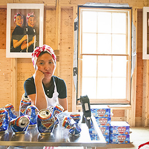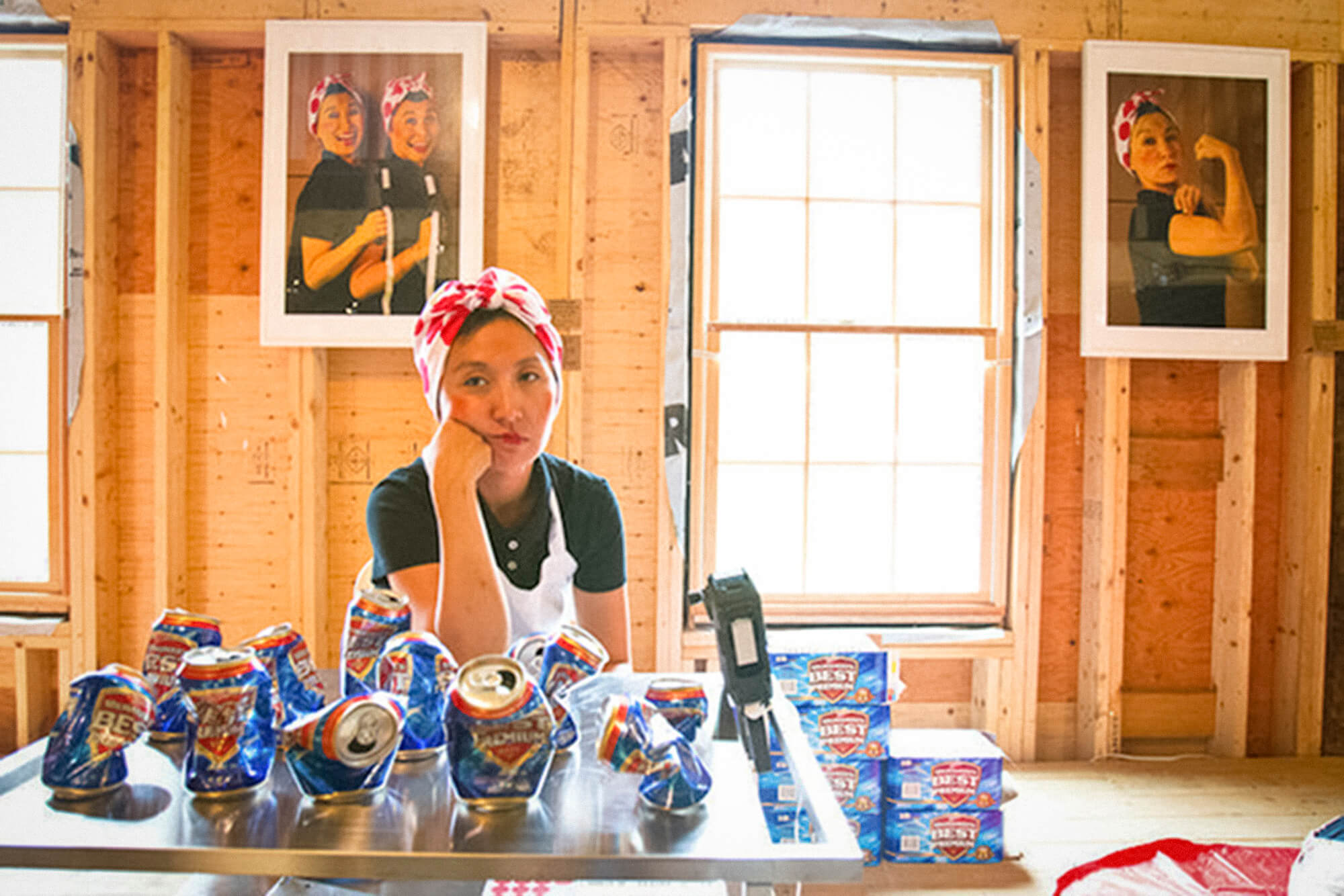 In Guns N’ Gals No. 99, the Disorientals assume the guise of Rosie the Riveter to serve up free beer. Gunning for the U S of A, the twosome crushes Milwaukee’s Best cans in their biceps, transforming the empties into one-of-a-kind Disorientalist sculptures, which they label and sell with a price tag gun.
