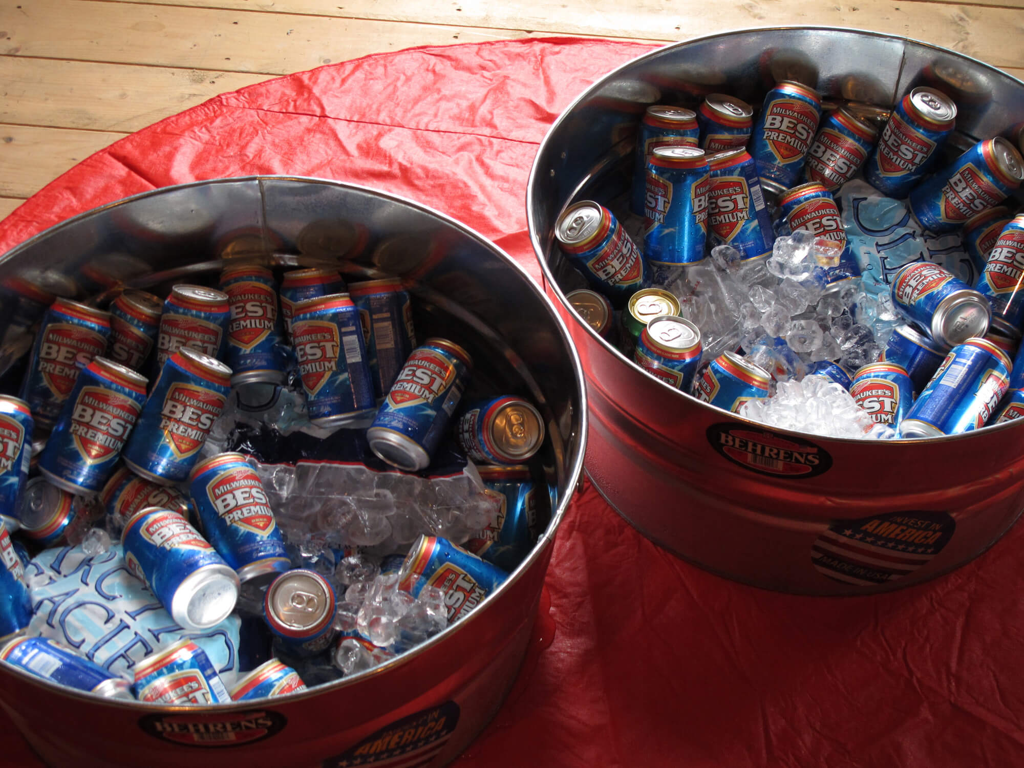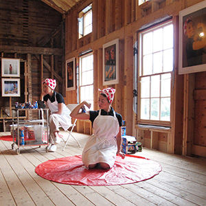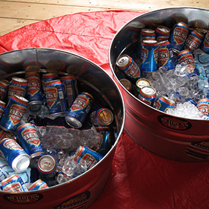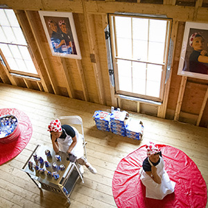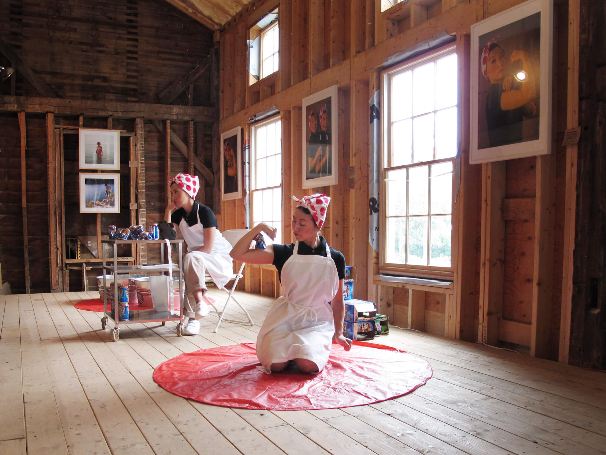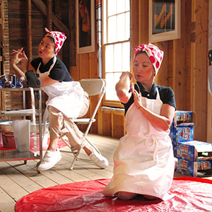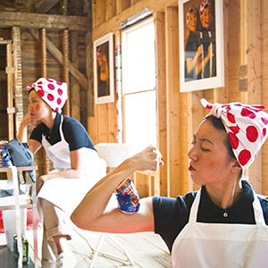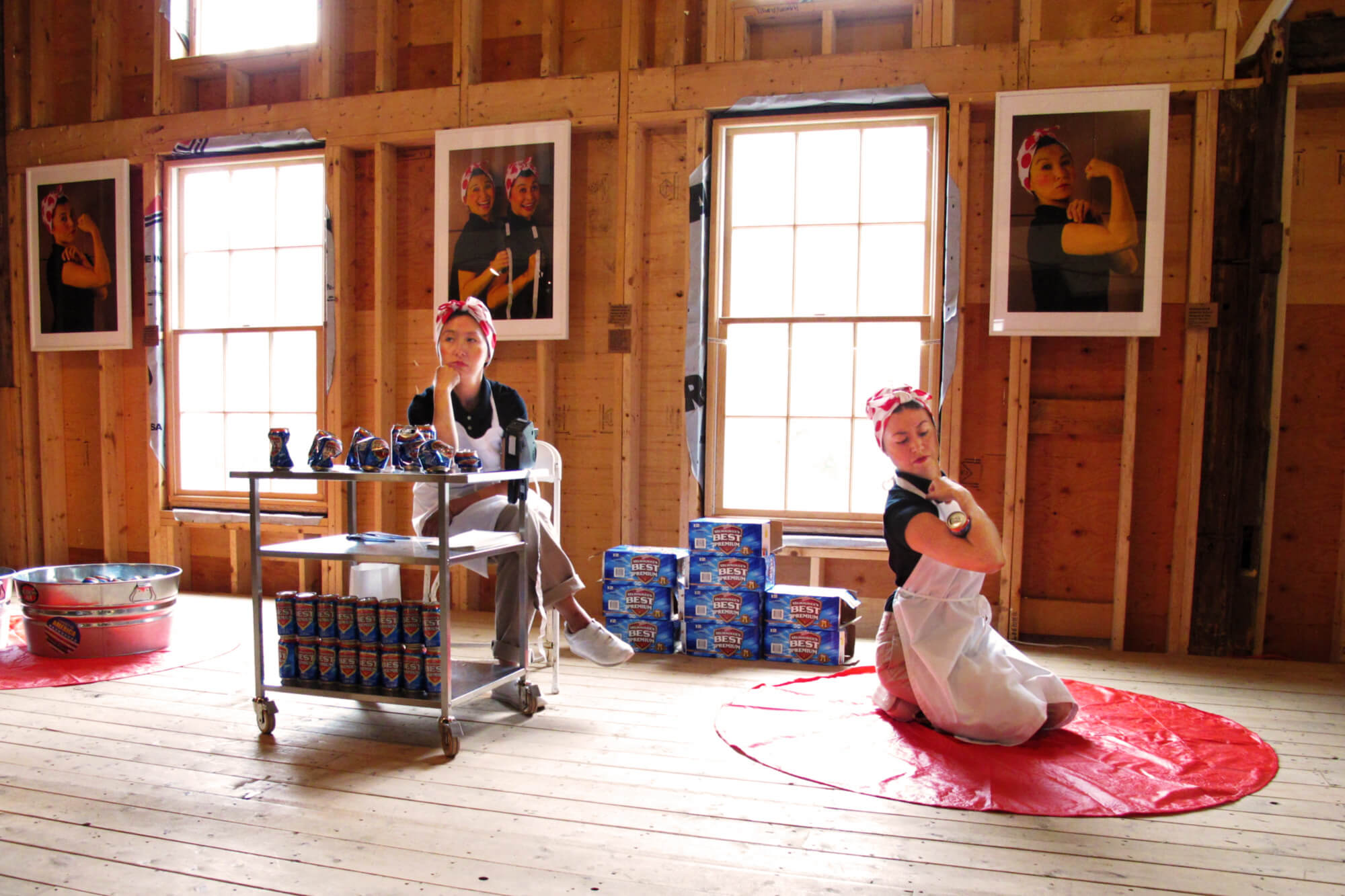 In Guns N’ Gals No. 99, the Disorientals assume the guise of Rosie the Riveter to serve up free beer. Gunning for the U S of A, the twosome crushes Milwaukee’s Best cans in their biceps, transforming the empties into one-of-a-kind Disorientalist sculptures, which they label and sell with a price tag gun.