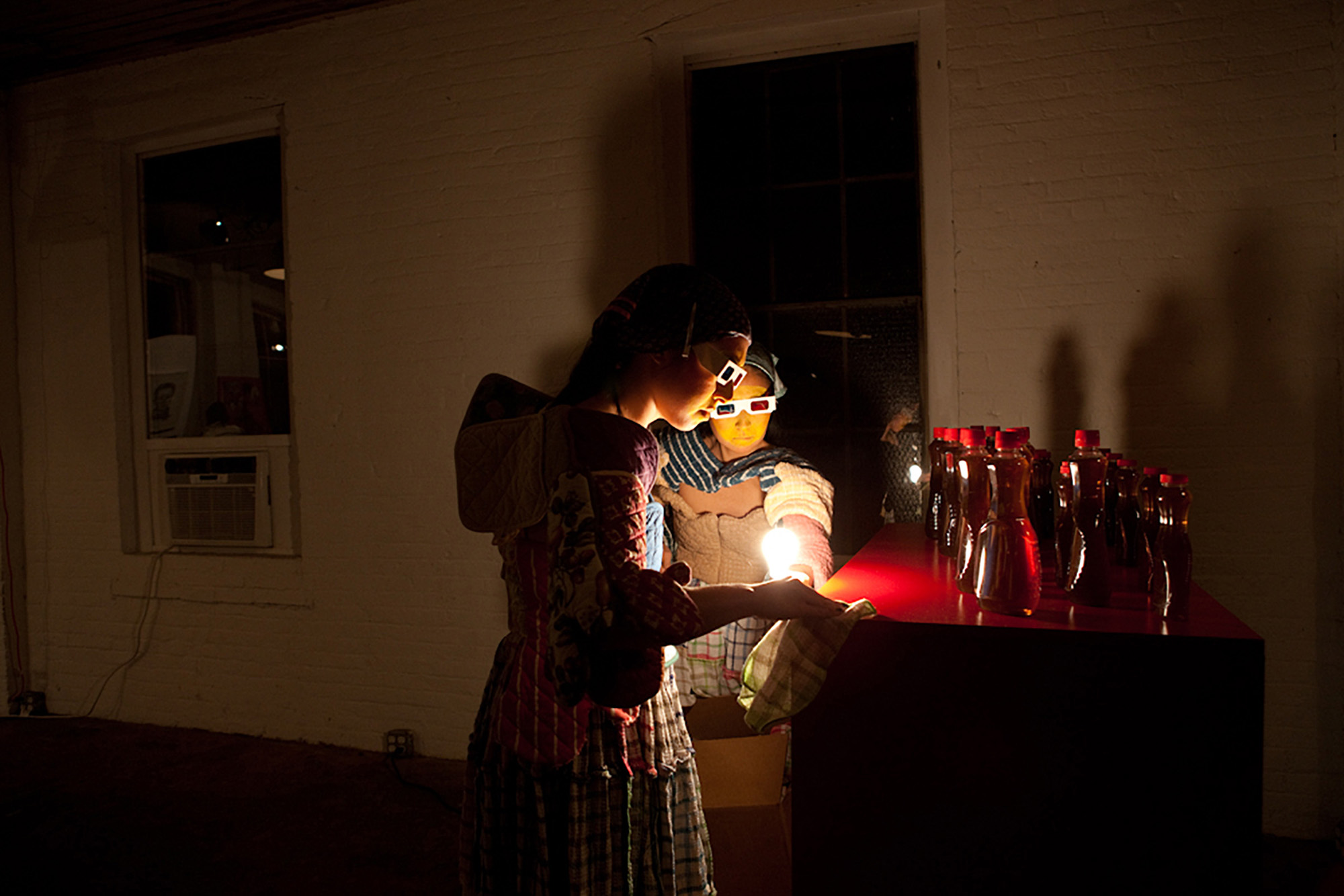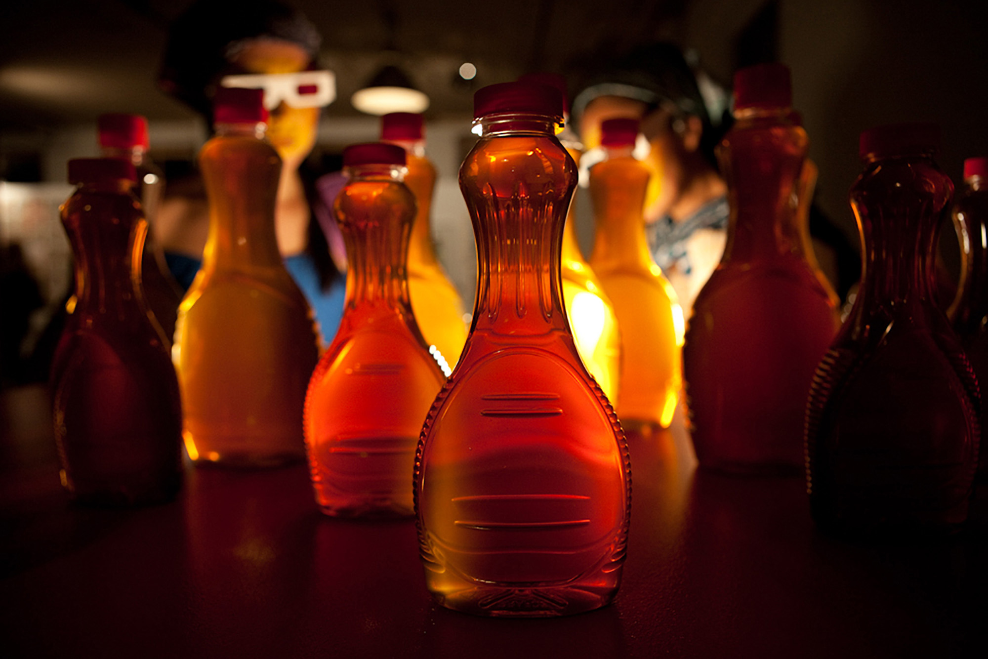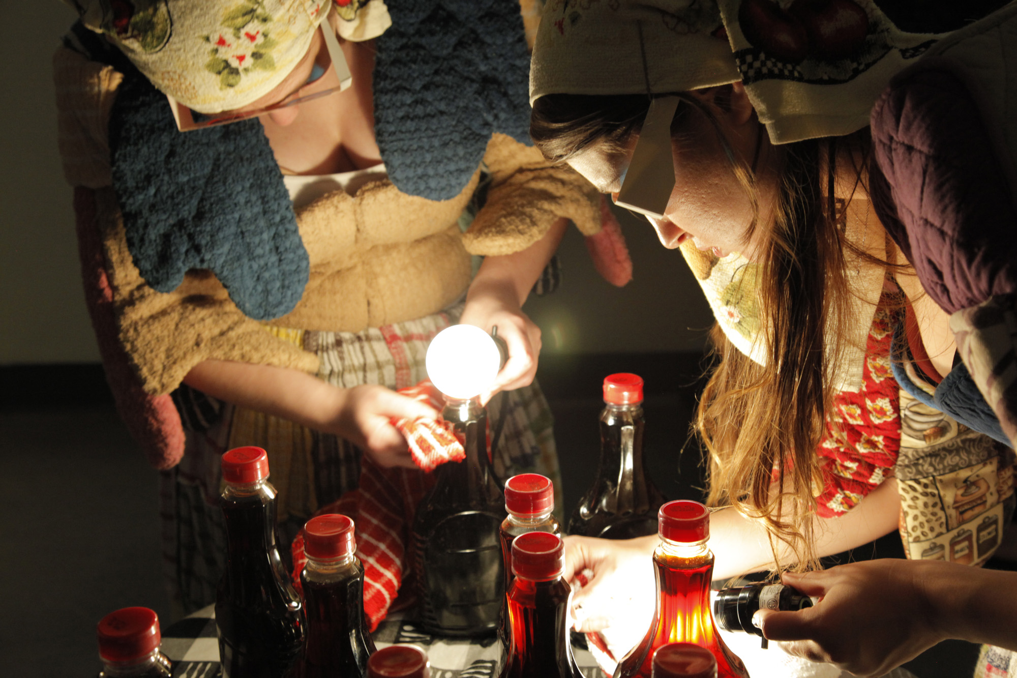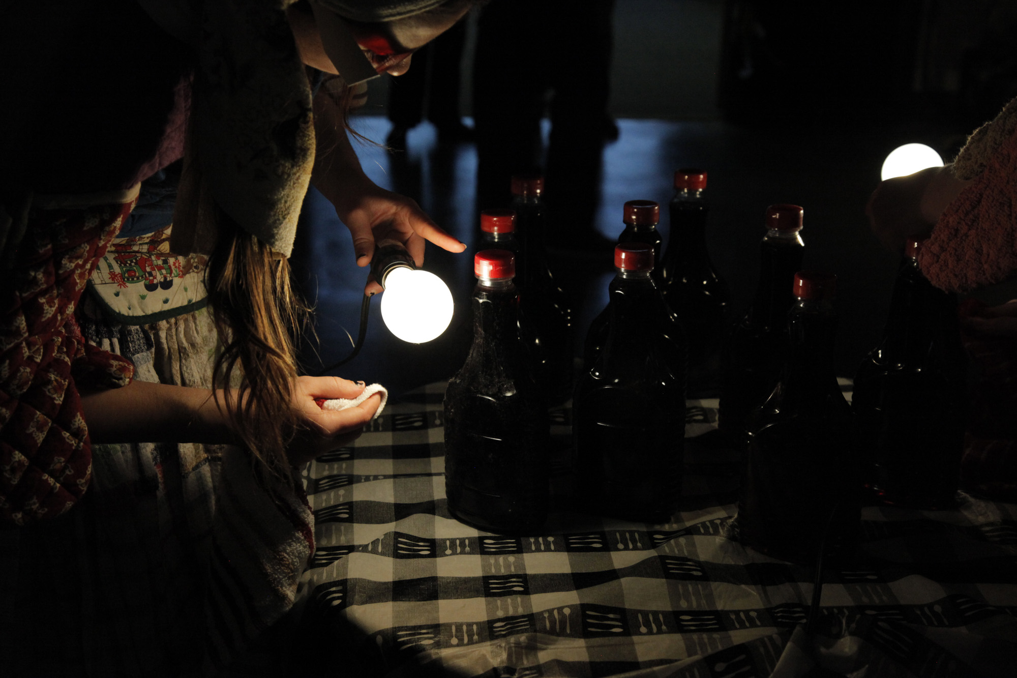 Durational performance with syrup bottles, light bulbs, ping pong table set