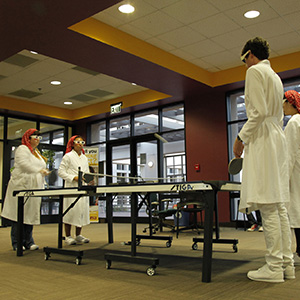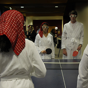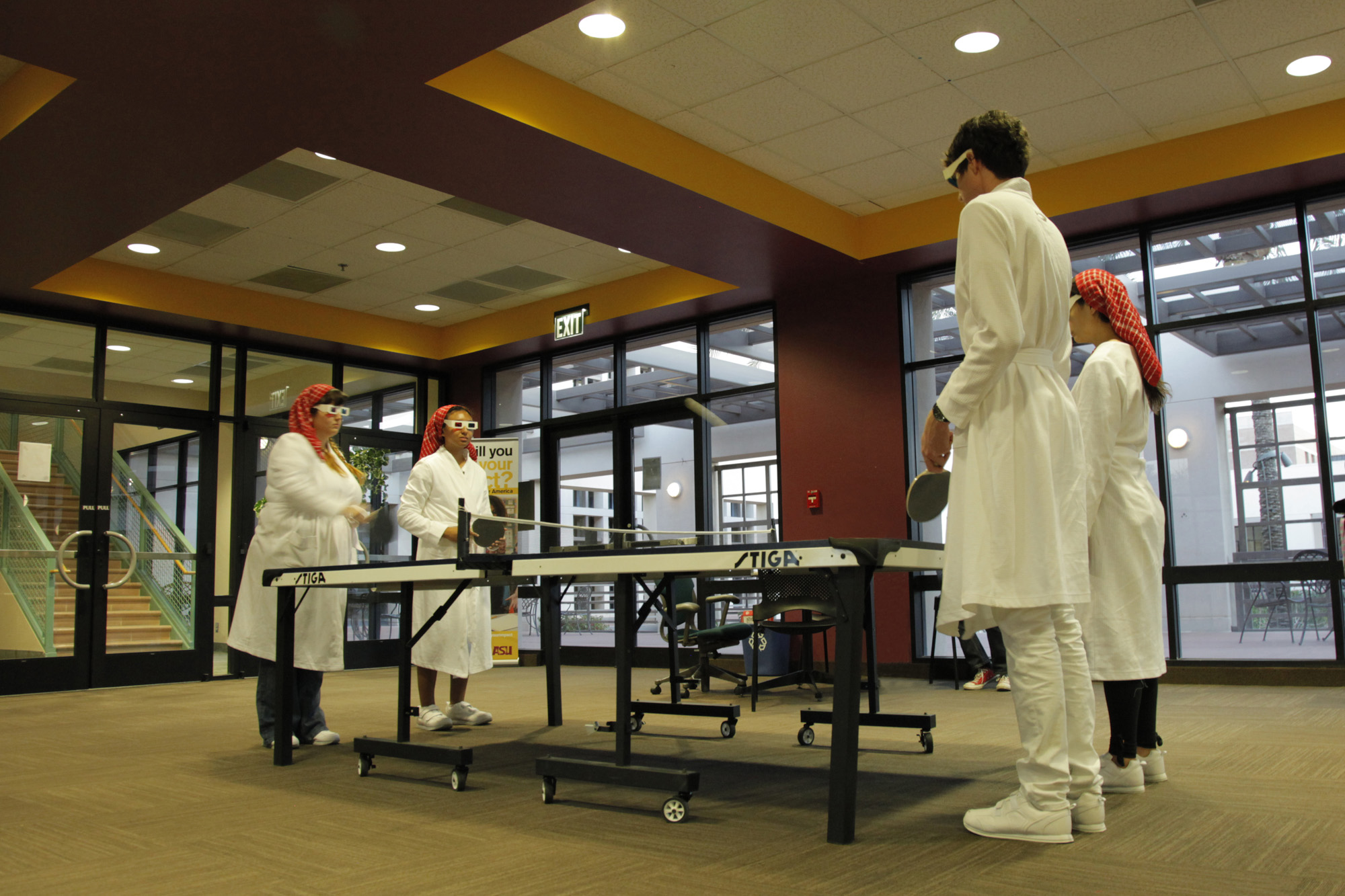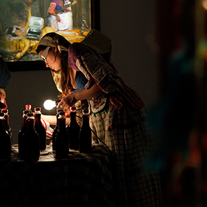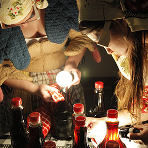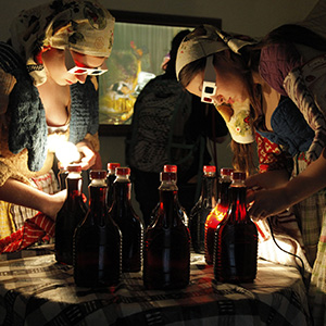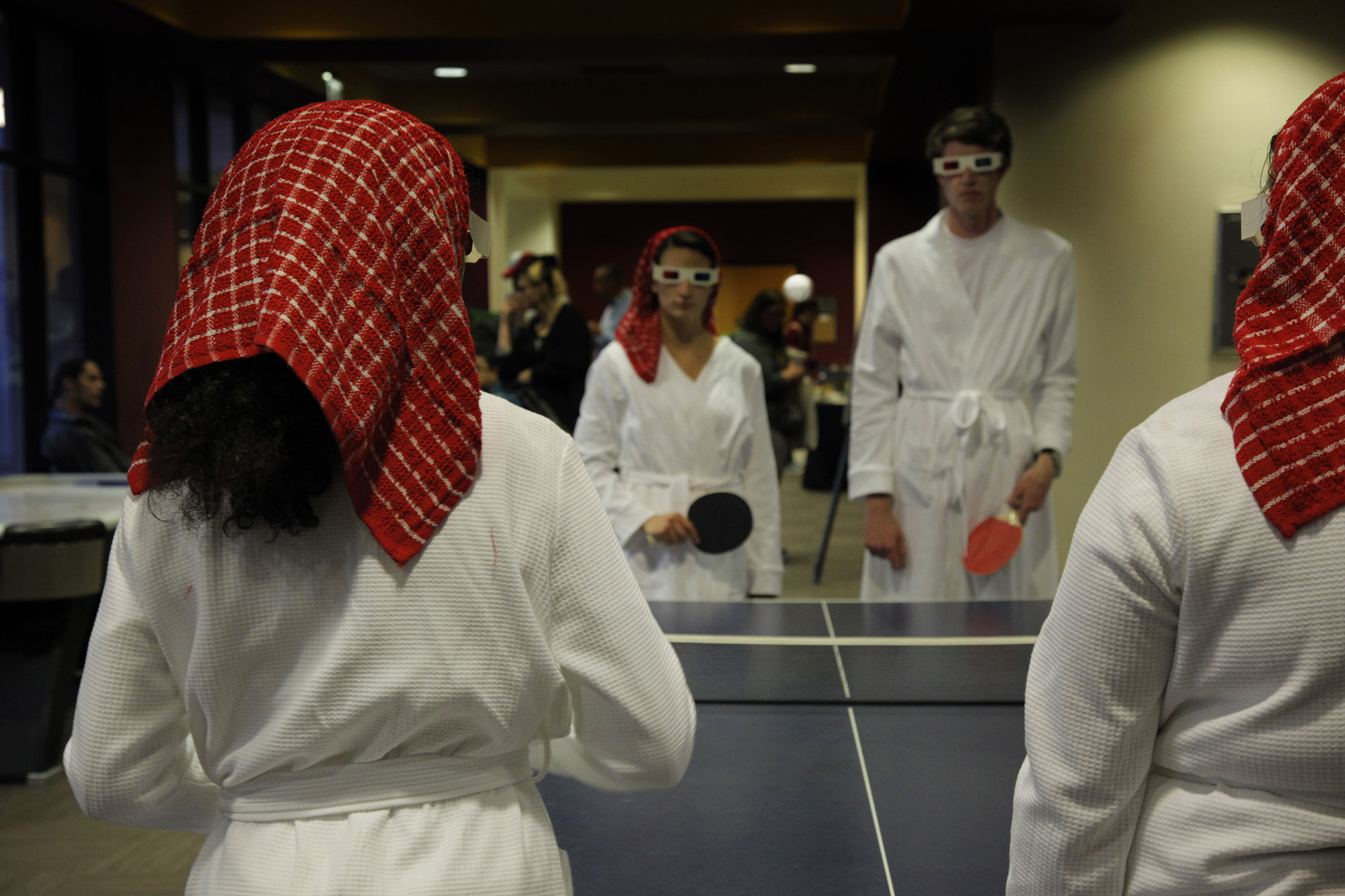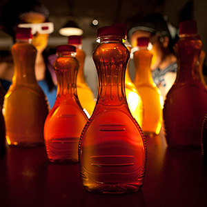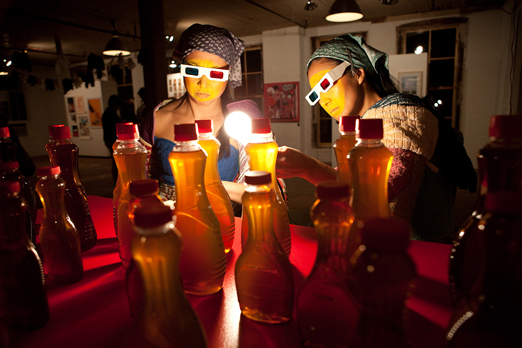Durational performance with syrup bottles, light bulbs, ping pong table set