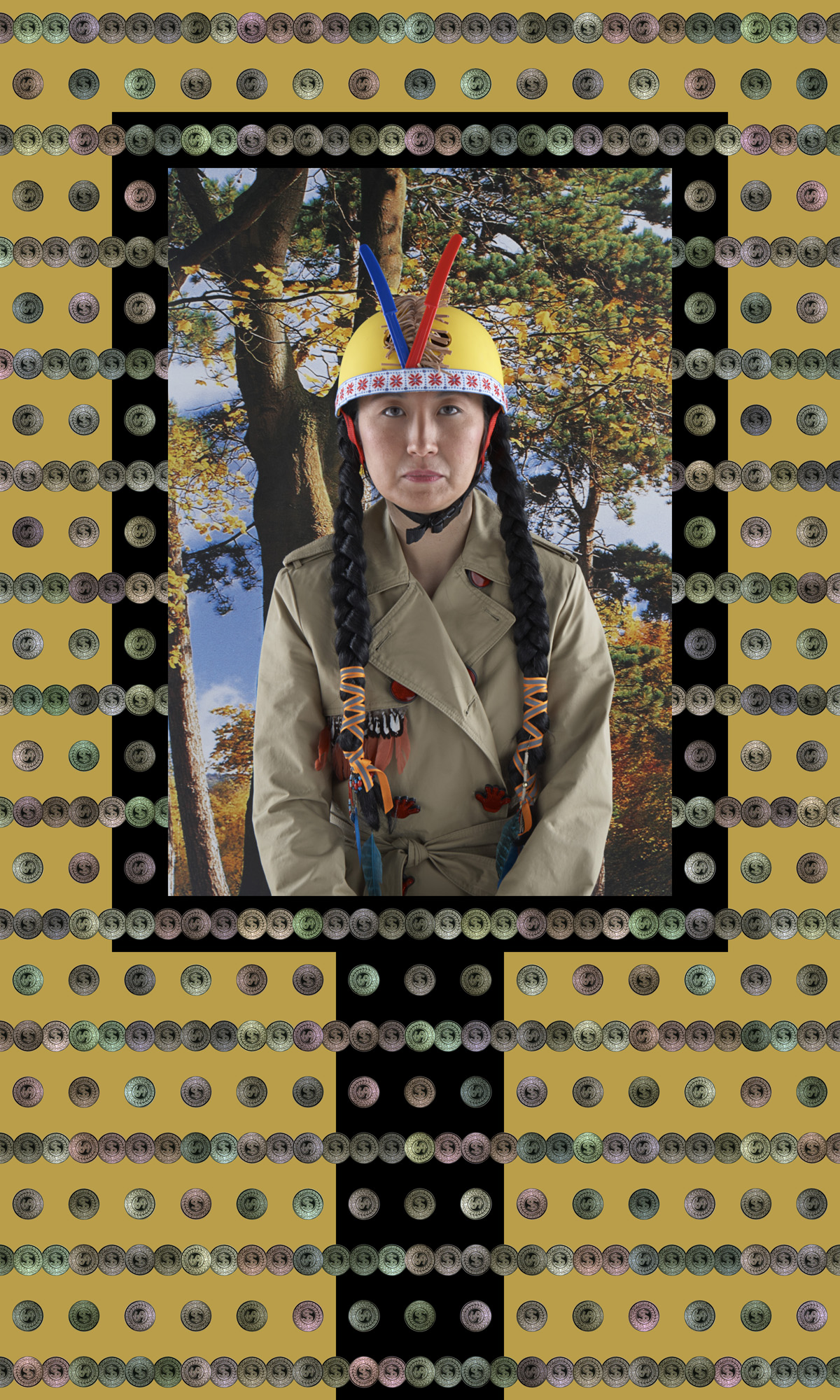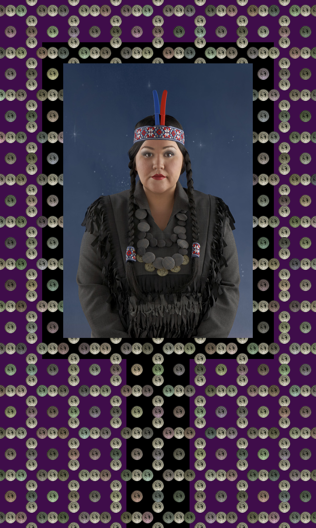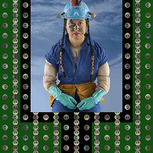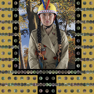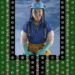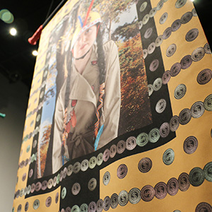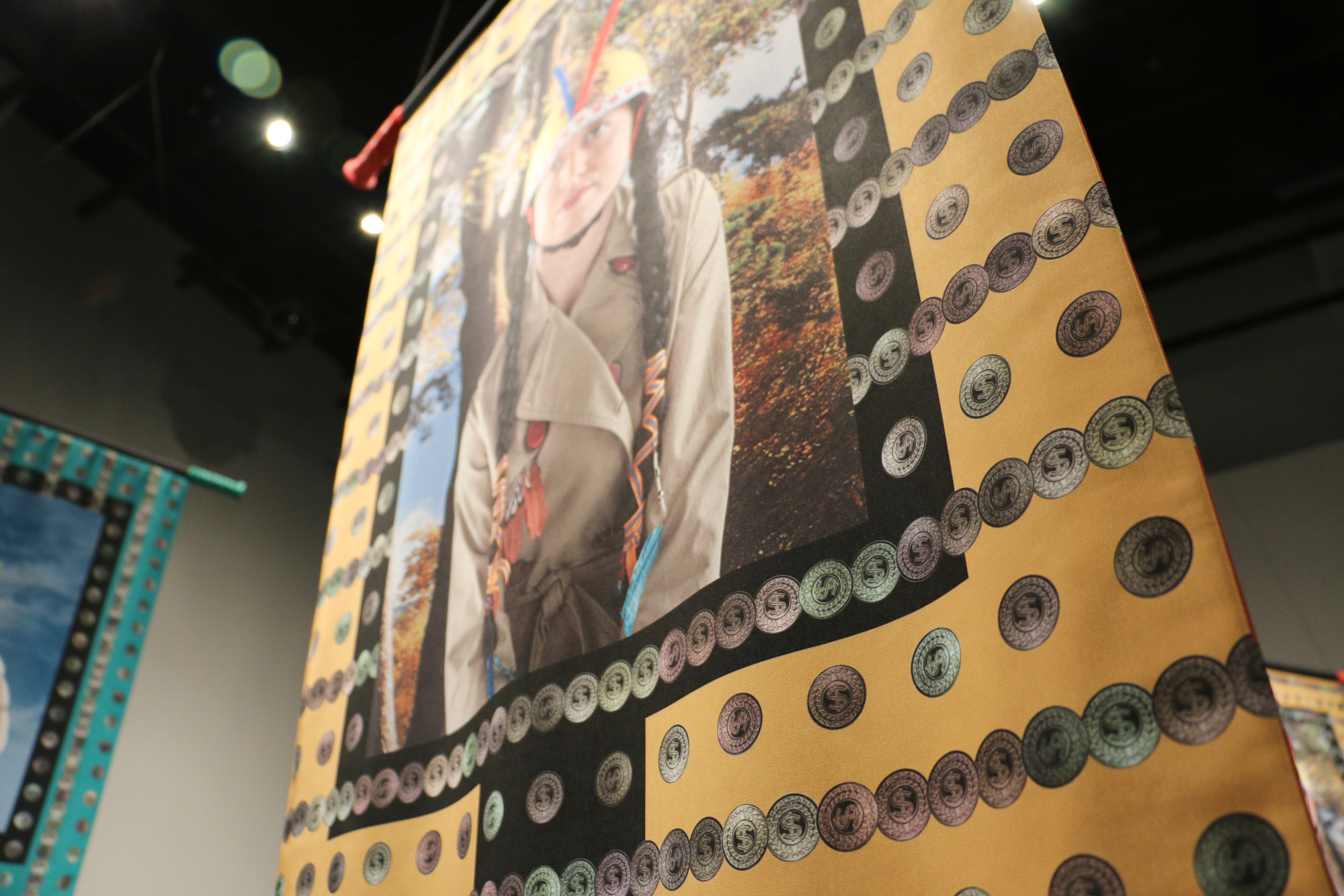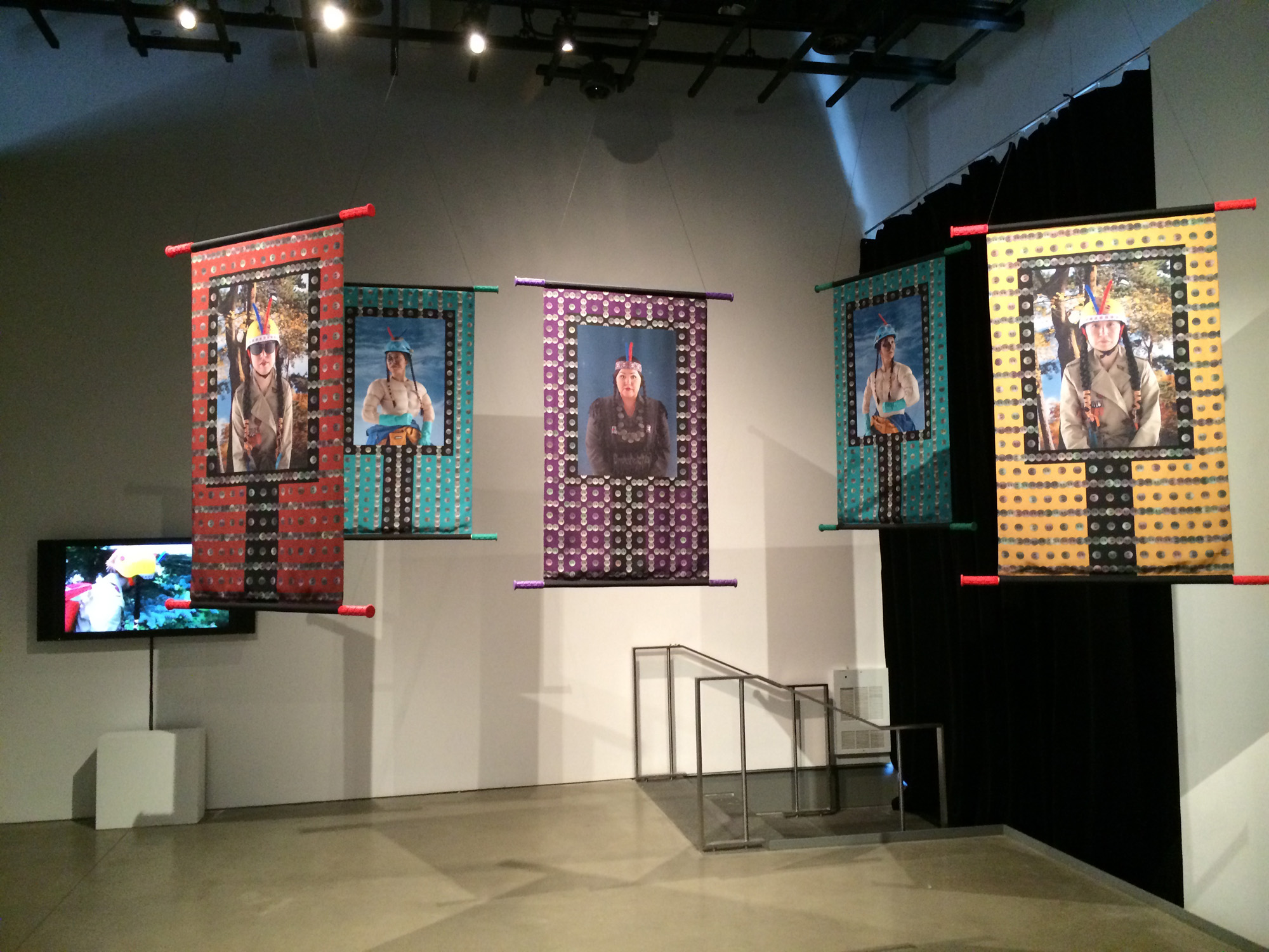 Two-sided photographic fabric banners styled after Thangka cloths hang from the ceiling, rotating on motors. They picture the cast of Maiden Voyage: The Spies, The Workers, and The Maiden.