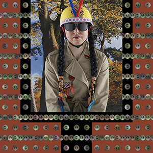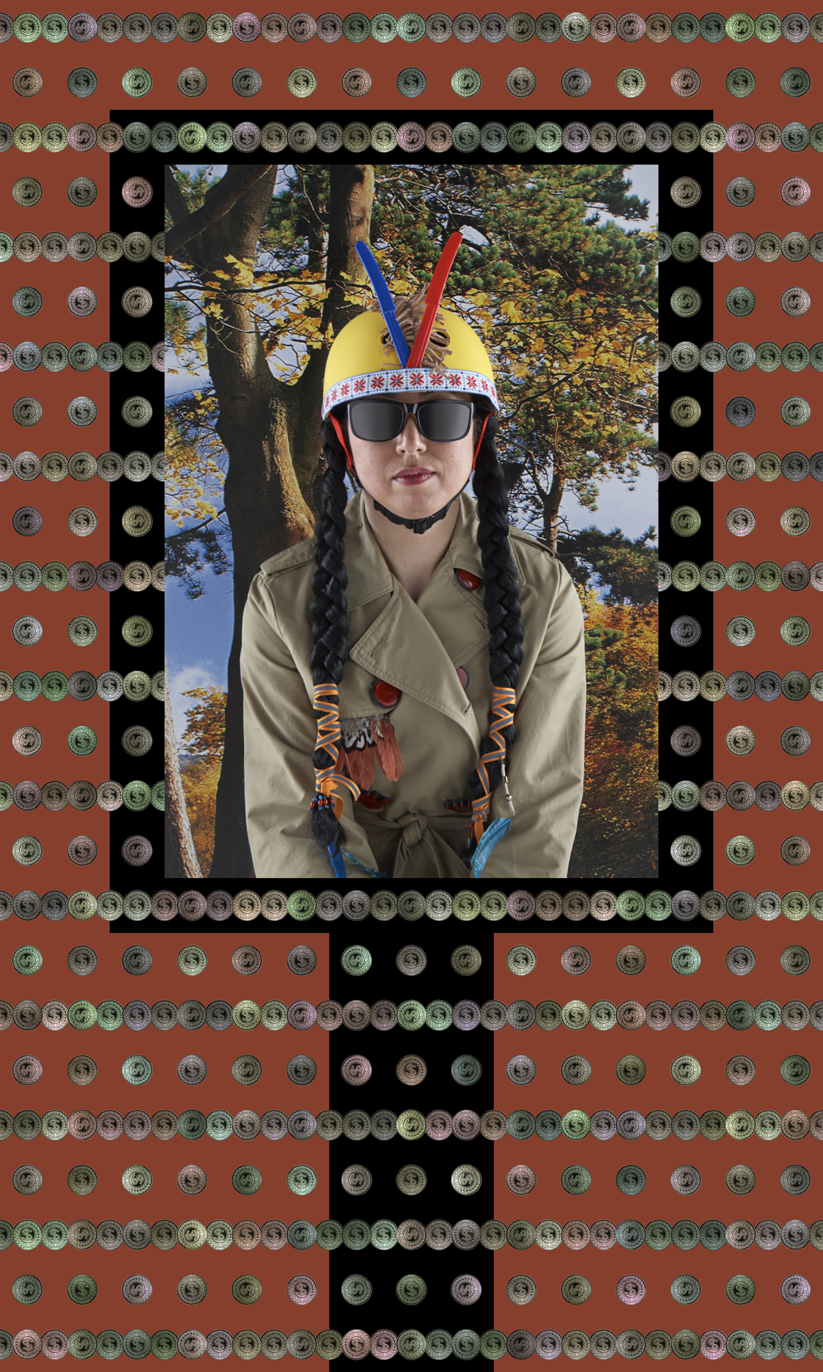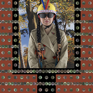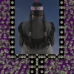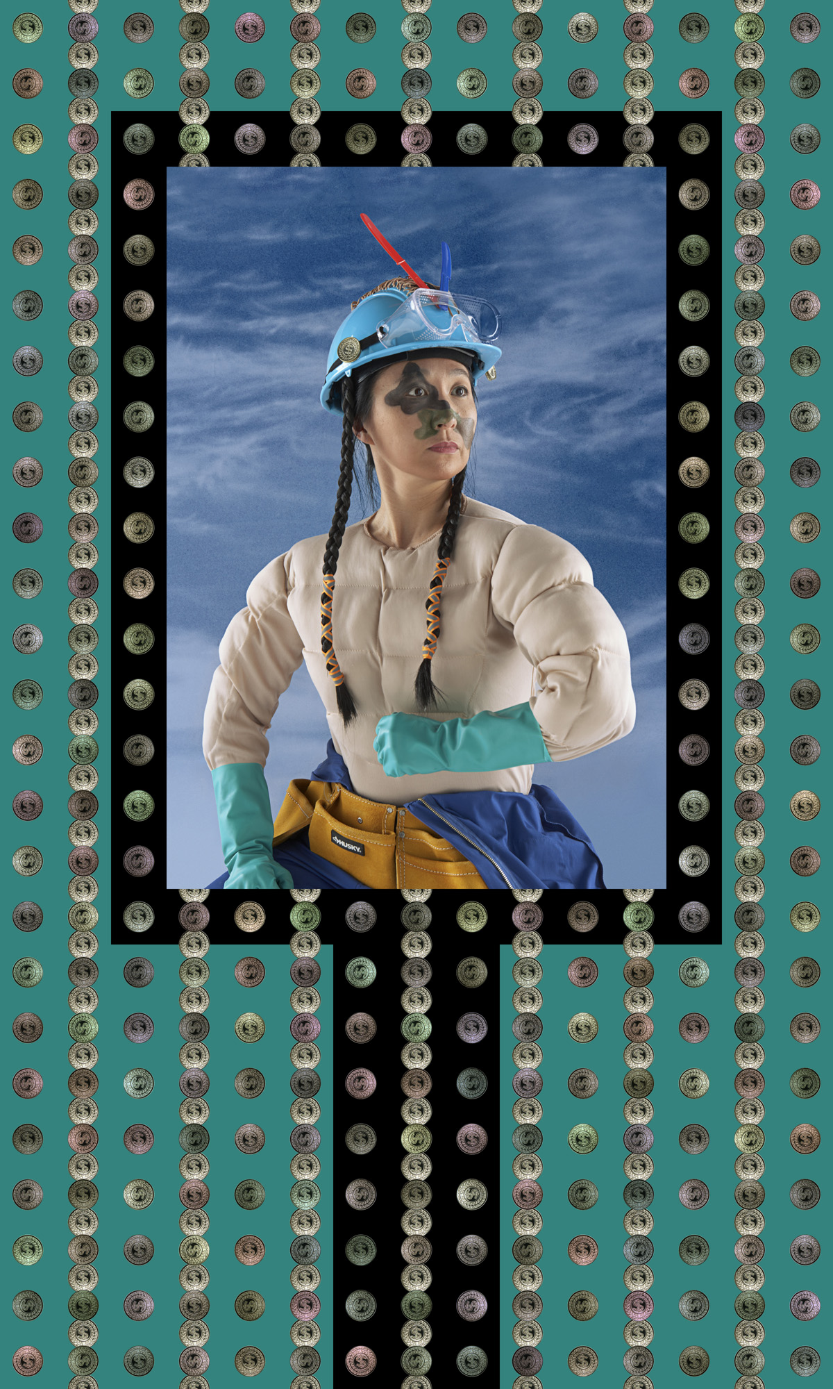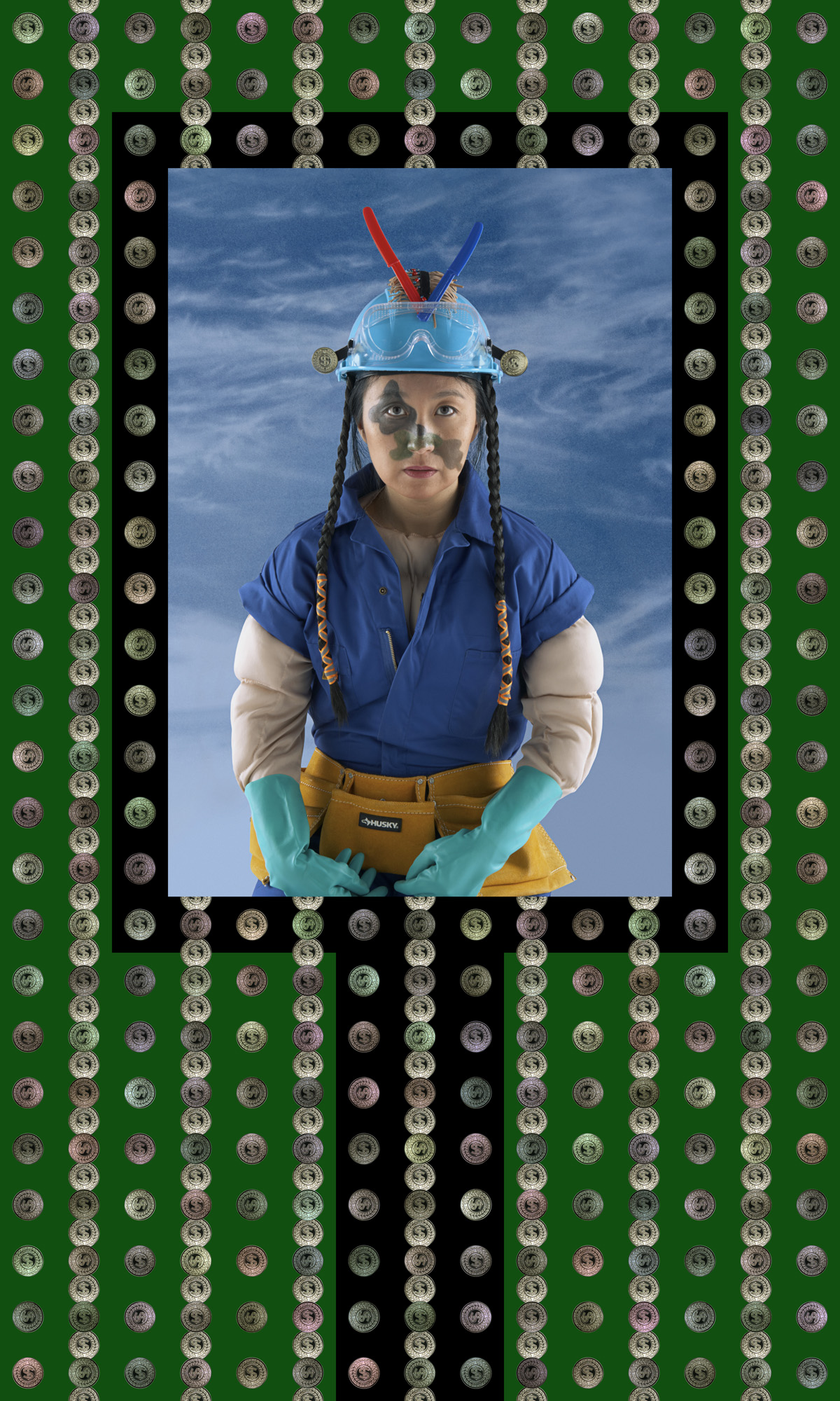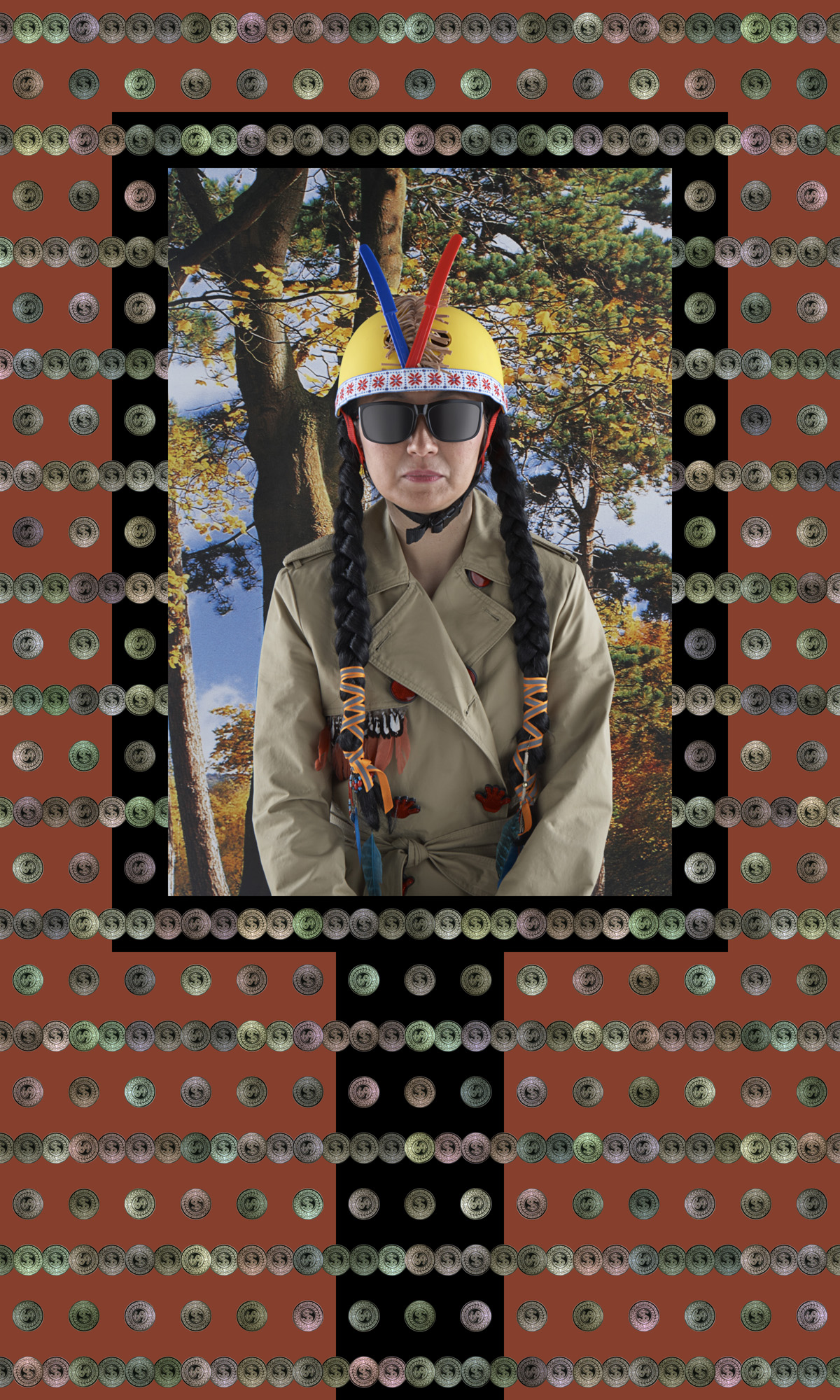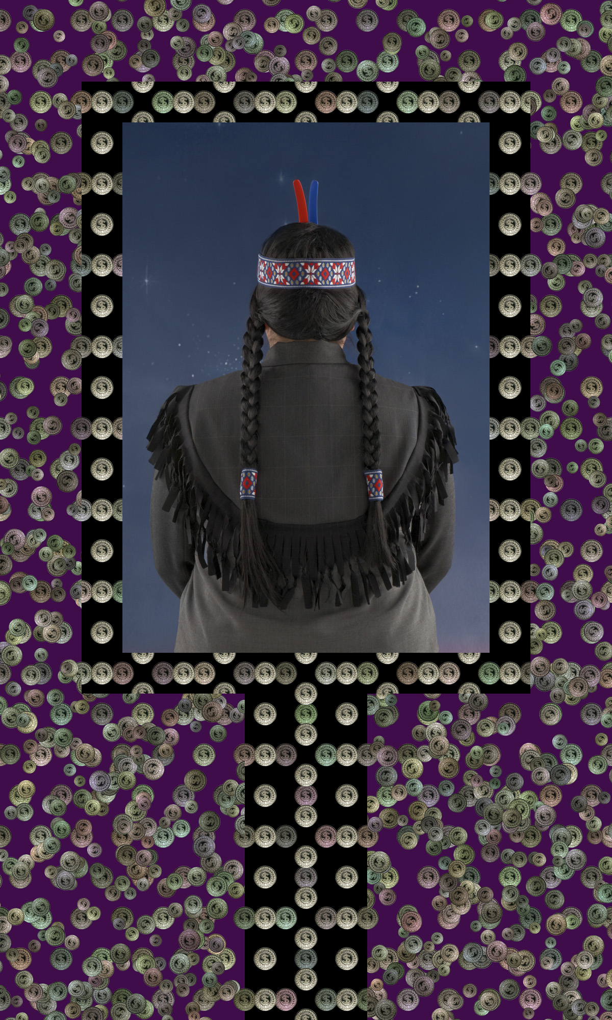 Two-sided photographic fabric banners styled after Thangka cloths hang from the ceiling, rotating on motors. They picture the cast of Maiden Voyage: The Spies, The Workers, and The Maiden.