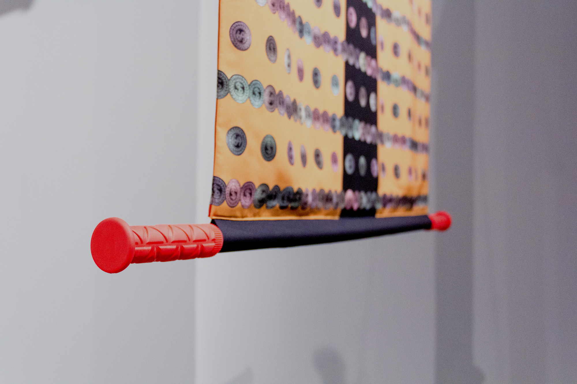 Five two-sided photographic fabric banners, motors, wood, bicycle handle grips